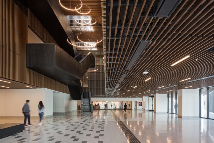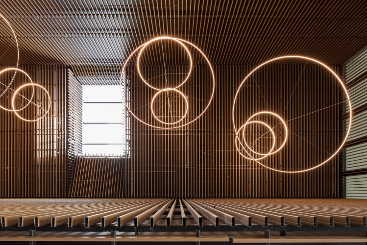 Forro linear aberto com painéis dispostos lado a lado na vertical