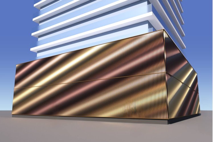 Os painéis de alumínio se entrelaçam nessa criação única, que surpreende, em forma, luz e cor, conforme a angulação. O Cinetic Brise ainda une esse design moderno à inovação: ele bloqueia a incidência de luz solar direta, proporcionando conforto visual e térmico.