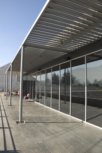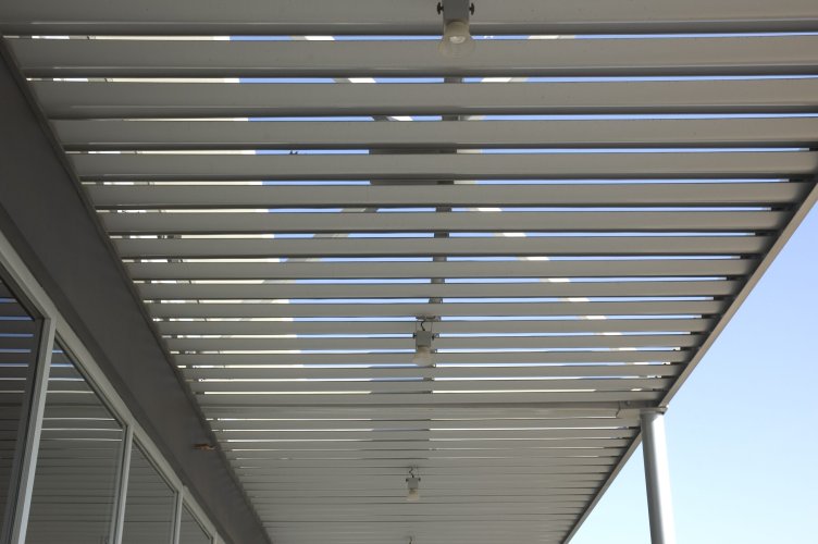 O brise Sunlines Hunter Douglas é uma solução de controle solar passivo composto por porta-painéis, clips e painéis lisos ou perfurados. Devido a sua configuração, é mais utilizado como brise zenital. Os painéis inferiores atuam como canal condutor de águas pluviais, evitando que a parte da água caia diretamente no piso. Há uma transmissão da luminosidade devido ao reflexo da luz direta entre os painéis inferiores e superiores, por isso é recomendada a utilização de cores claras, preferencialmente branco.